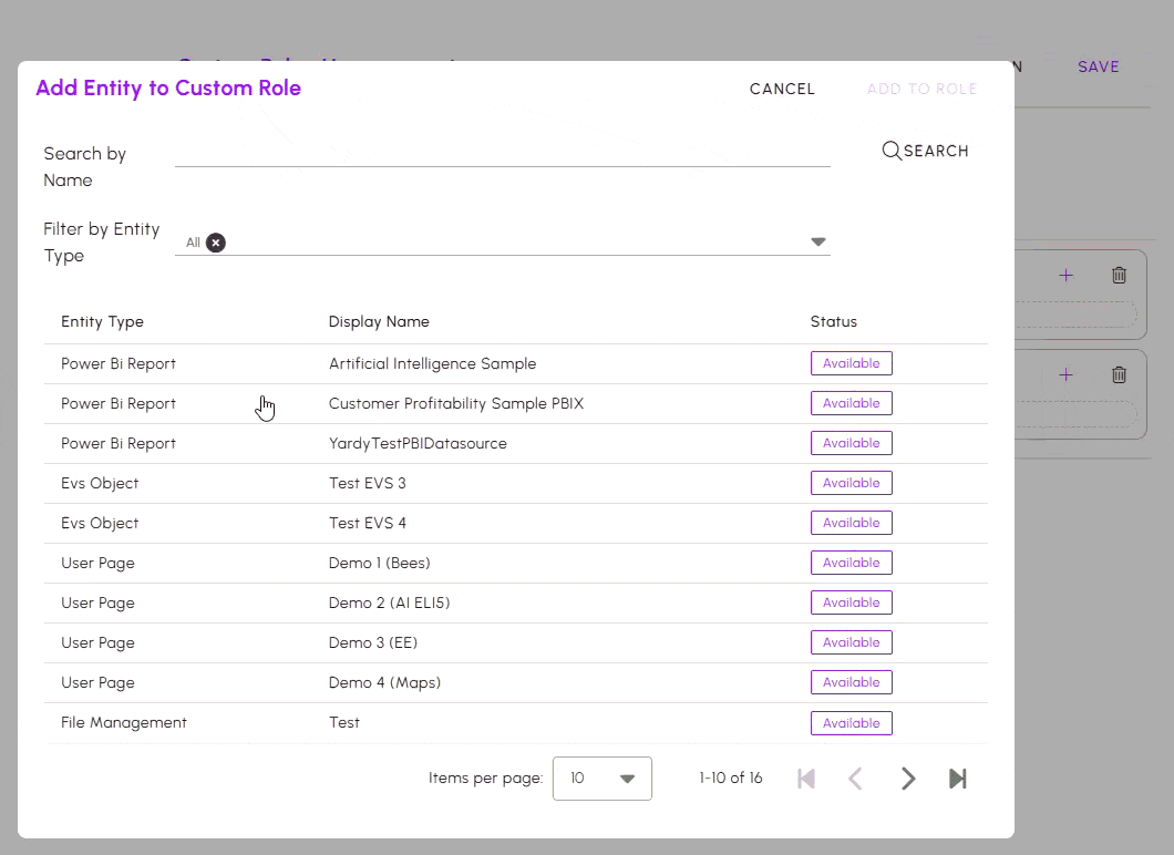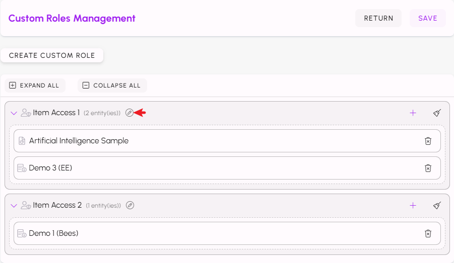By clicking on the + button next to each Custom Role, you can add various resources (entities) from your project to the role. By default, entities may be rolled up inside of the newly created role. In this case, click on the arrow next to each Custom Role to expand and view the content within.