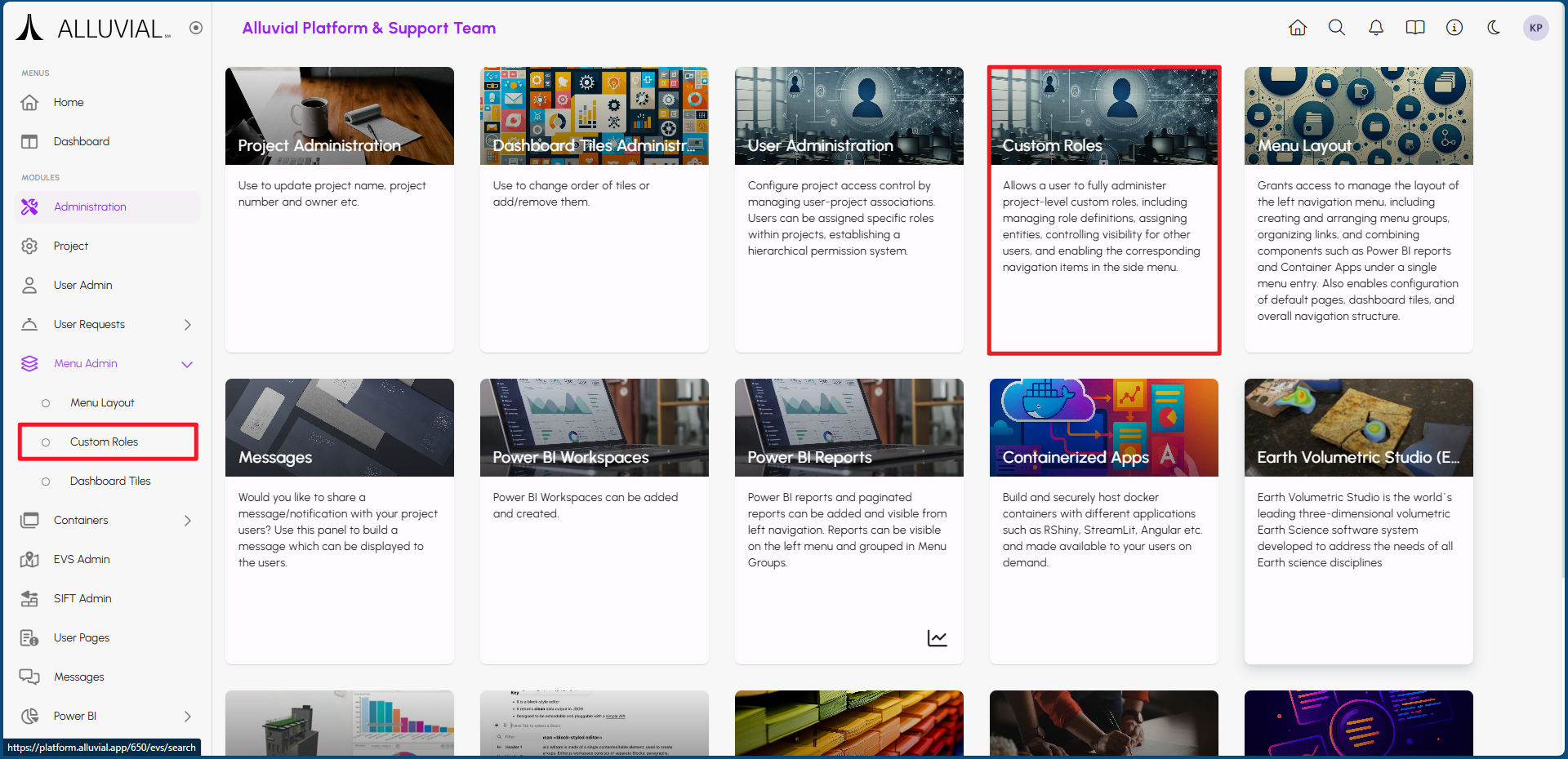 Custom Roles can be created and managed through the project administration page, accessible via the Menu Admin section in the left-hand navigation menu or by clicking on the Custom Roles card.
