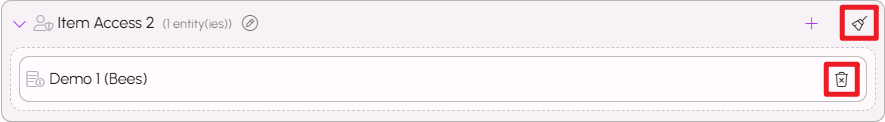 Clicking on the broom icon next to each role will remove all entities from that Custom Role. Clicking on the trash can icon beside an individual entity will remove just that item from the Custom Role.