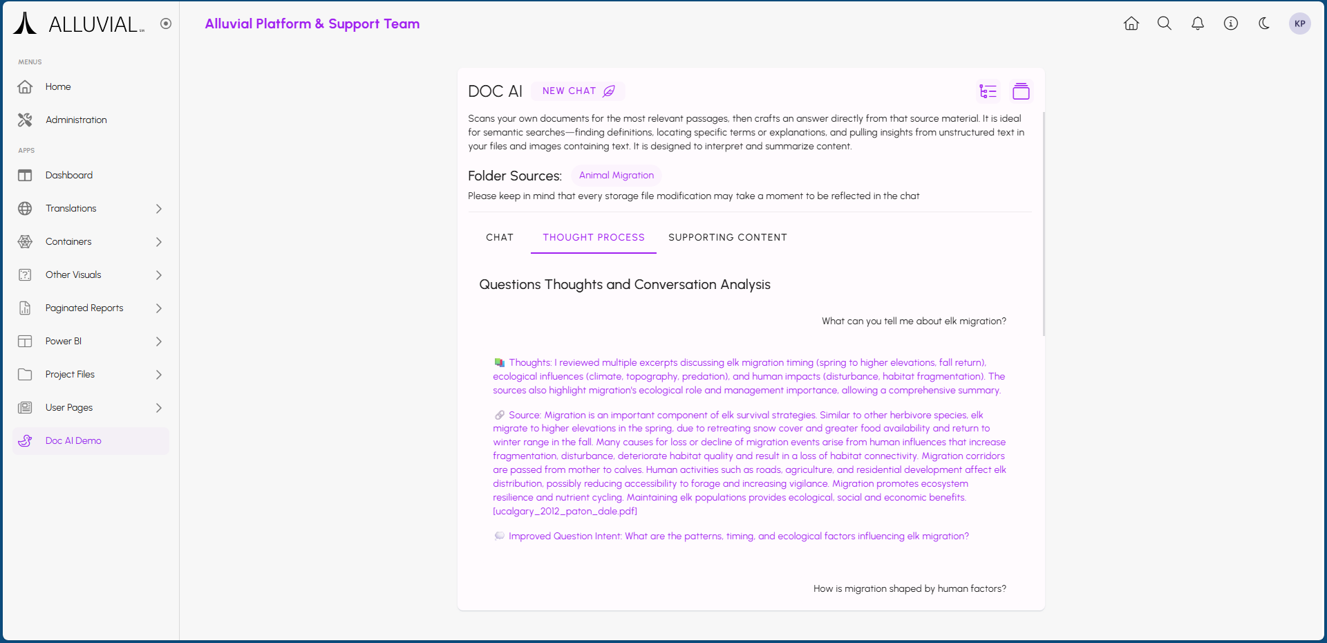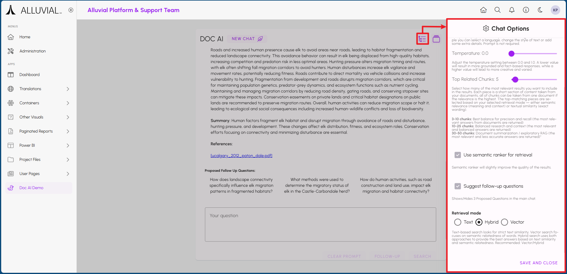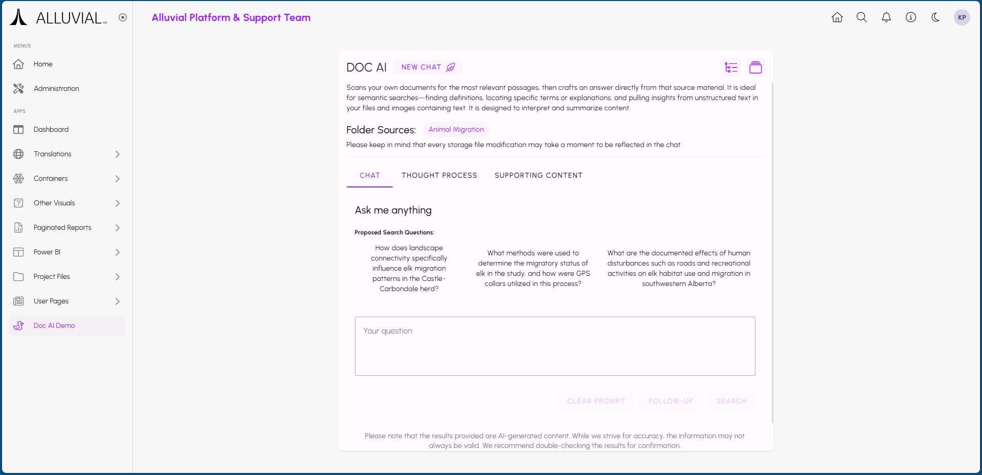 Once your Doc AI resource is set up and indexed, project users can start using it to search through the documents in the selected File Management directories. Users can find the resource within the project menu under the name you provided during setup, or within the designated menu group if one was selected.