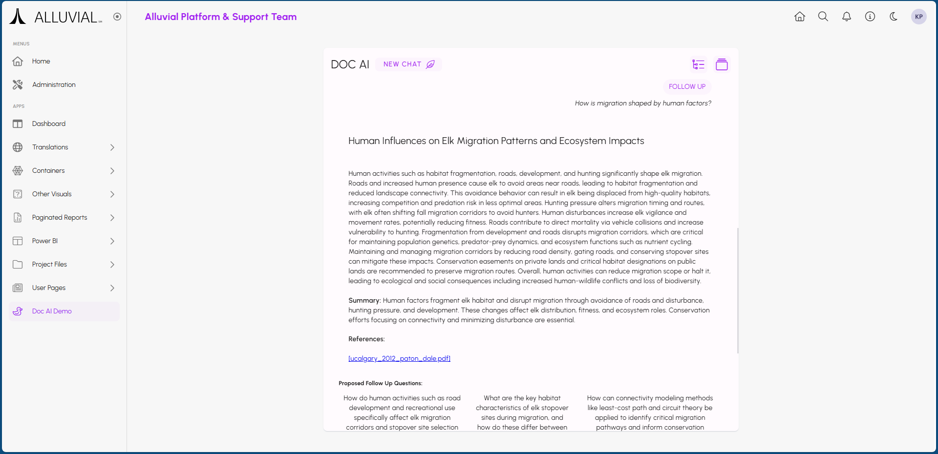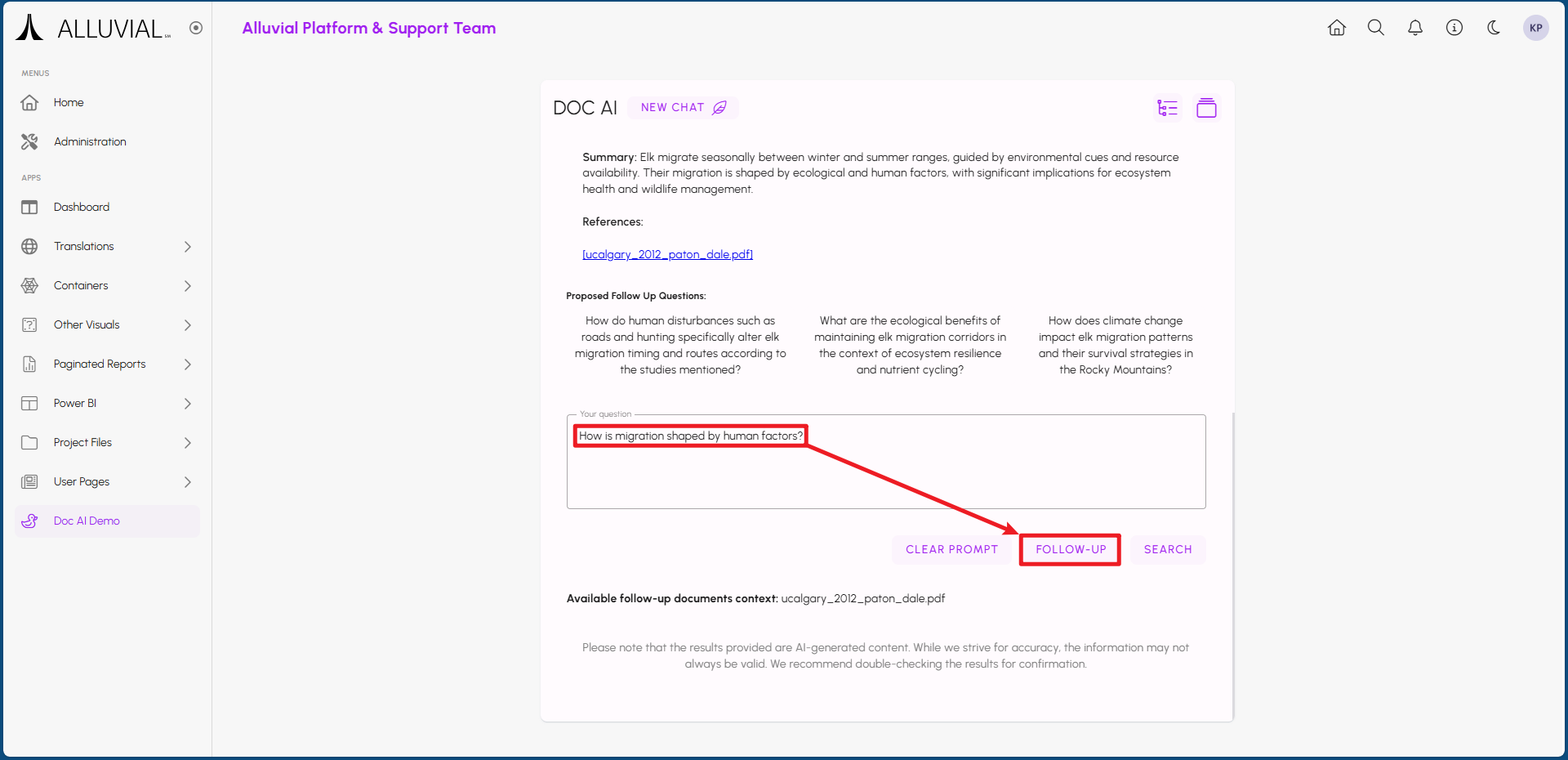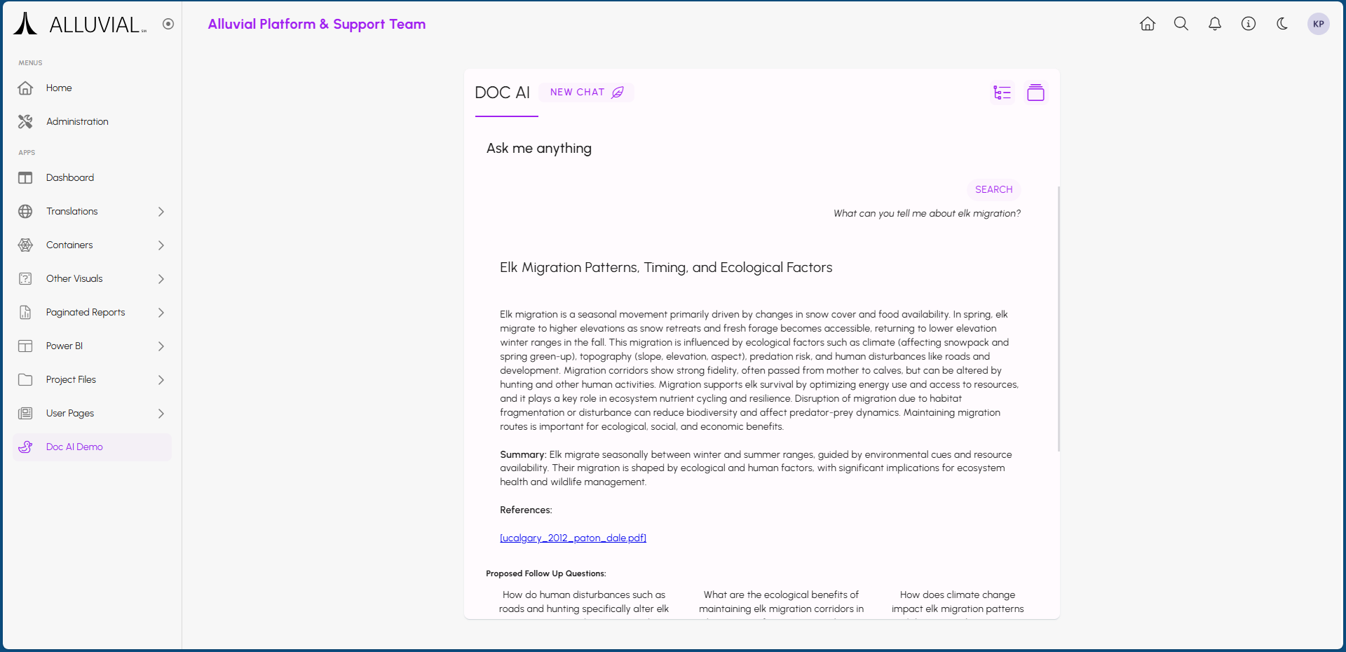Once your Doc AI resource is set up and indexed, project users can start using it to search through the documents in the selected File Management directories. Users can find the resource within the project menu under the name you provided during setup, or within the designated menu group if one was selected.