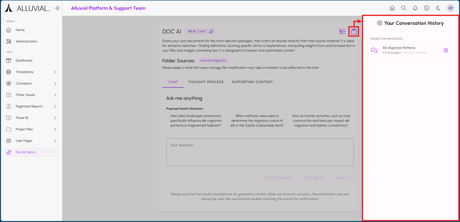 All previous interactions with the Doc AI resource are saved in the conversation history. At any time, users can revisit past queries and responses. History is kept private to each user, ensuring that individual search sessions remain confidential.