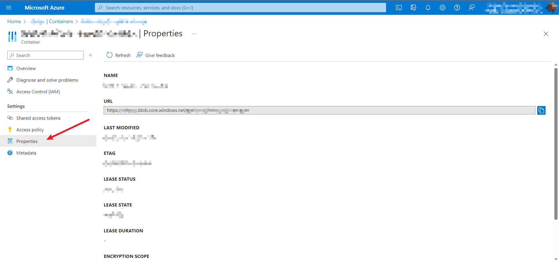 In the same menu, scroll down to Properties and copy the container URL.