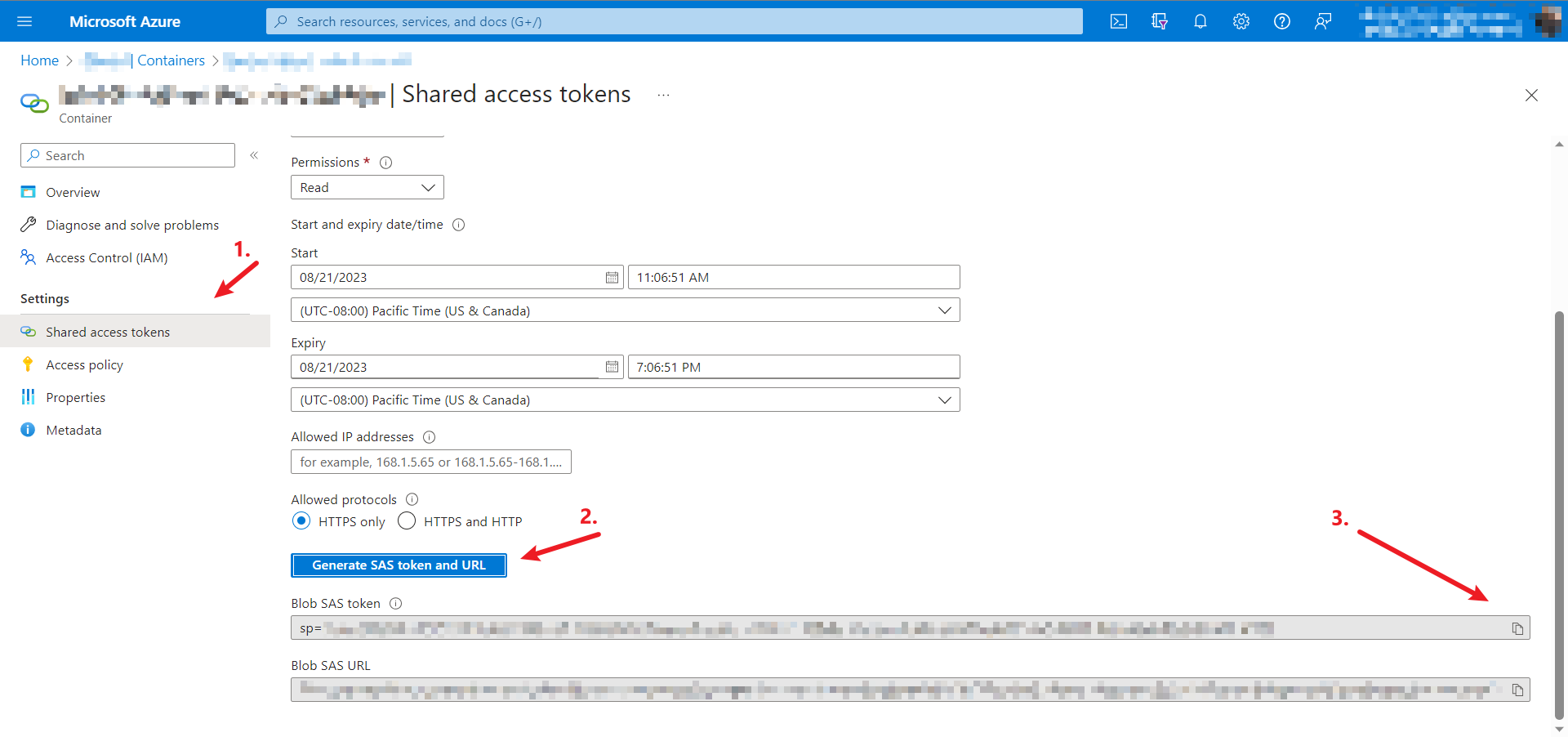 Click Generate SAS Token and URL, then copy only the Blob SAS Token (not the full SAS URL).