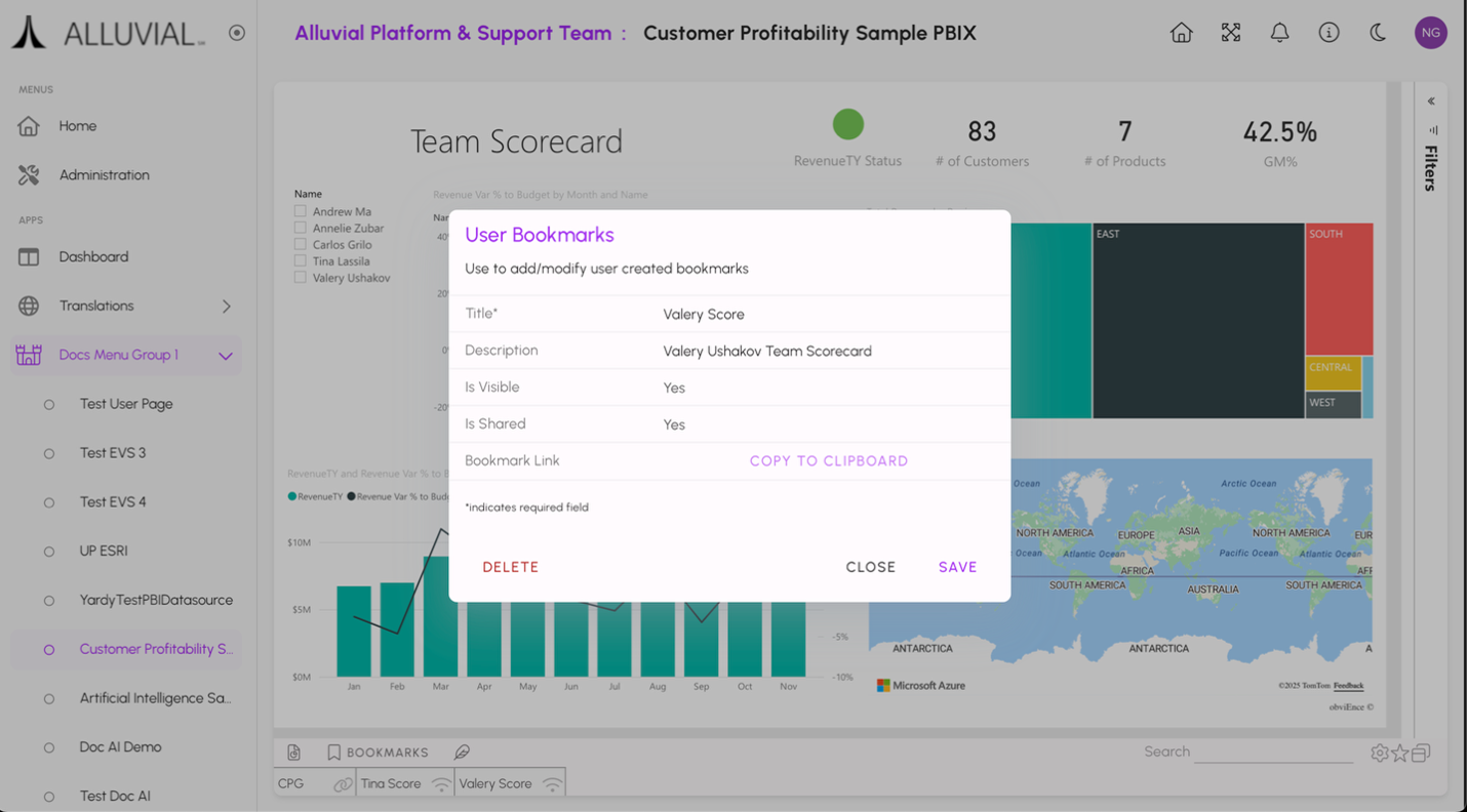 Deleting a bookmark permanently removes it from Alluvial. This action cannot be undone and affects all users who have access to the bookmark.
