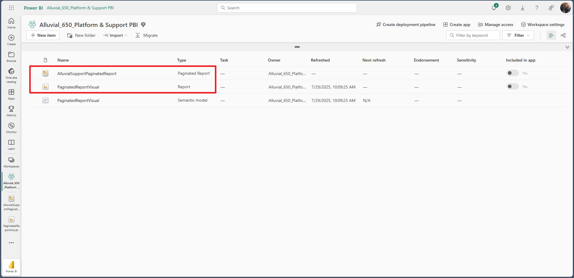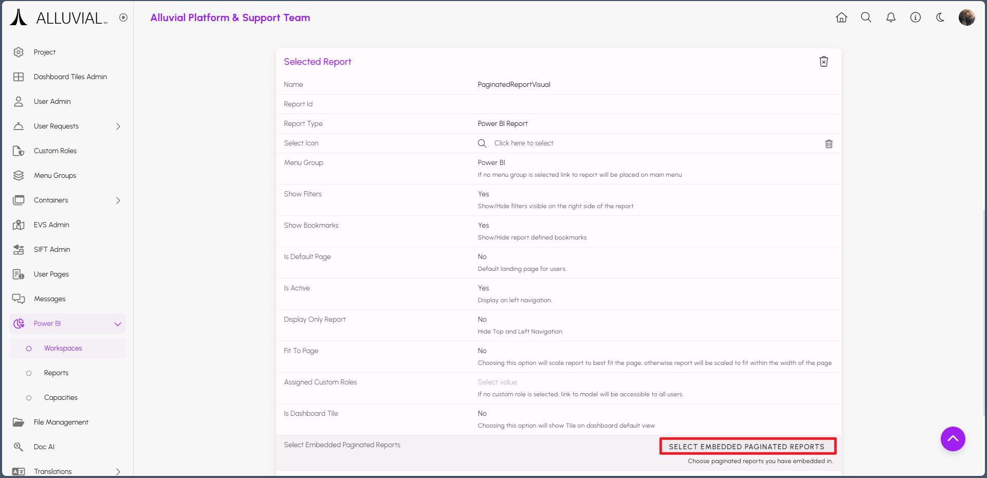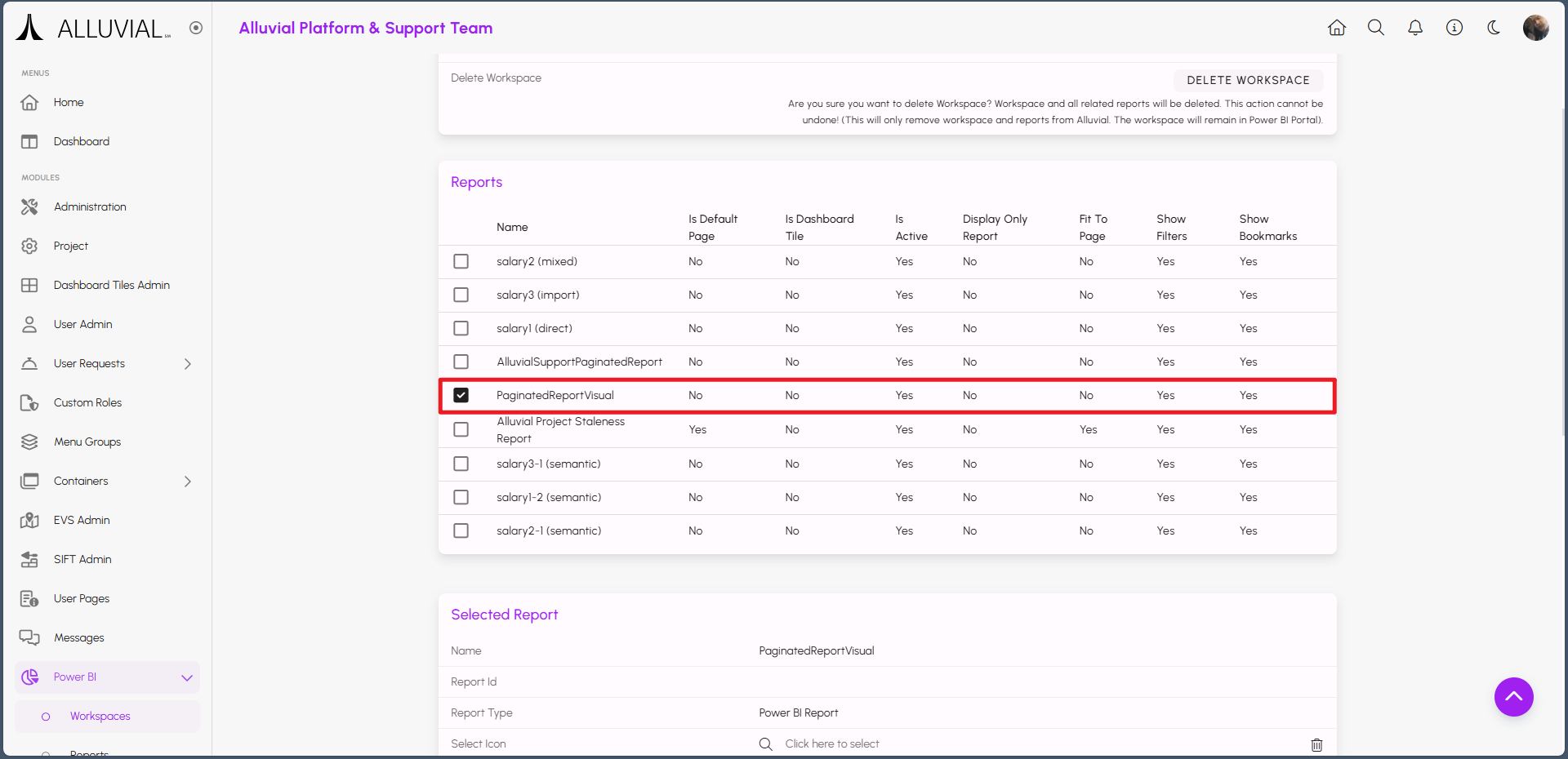 Once both reports are published to the same workspace, select the Power BI report containing the paginated visual in the Alluvial Power BI Workspaces & Reports module.