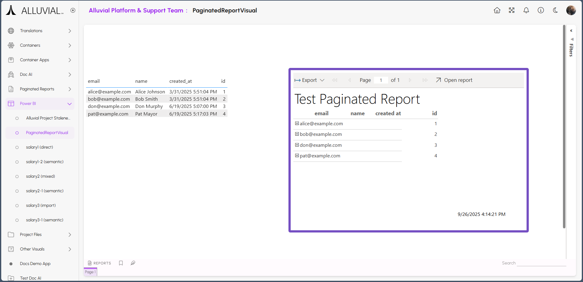 When you navigate to the Power BI report in Alluvial, you will see the embedded paginated report within the report.