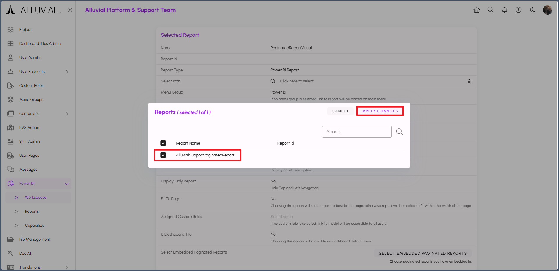 This will open a pop-up where you can select the paginated report(s) to embed. After selecting the desired report(s), click APPLY CHANGES. Make sure that you save the form after applying the changes.