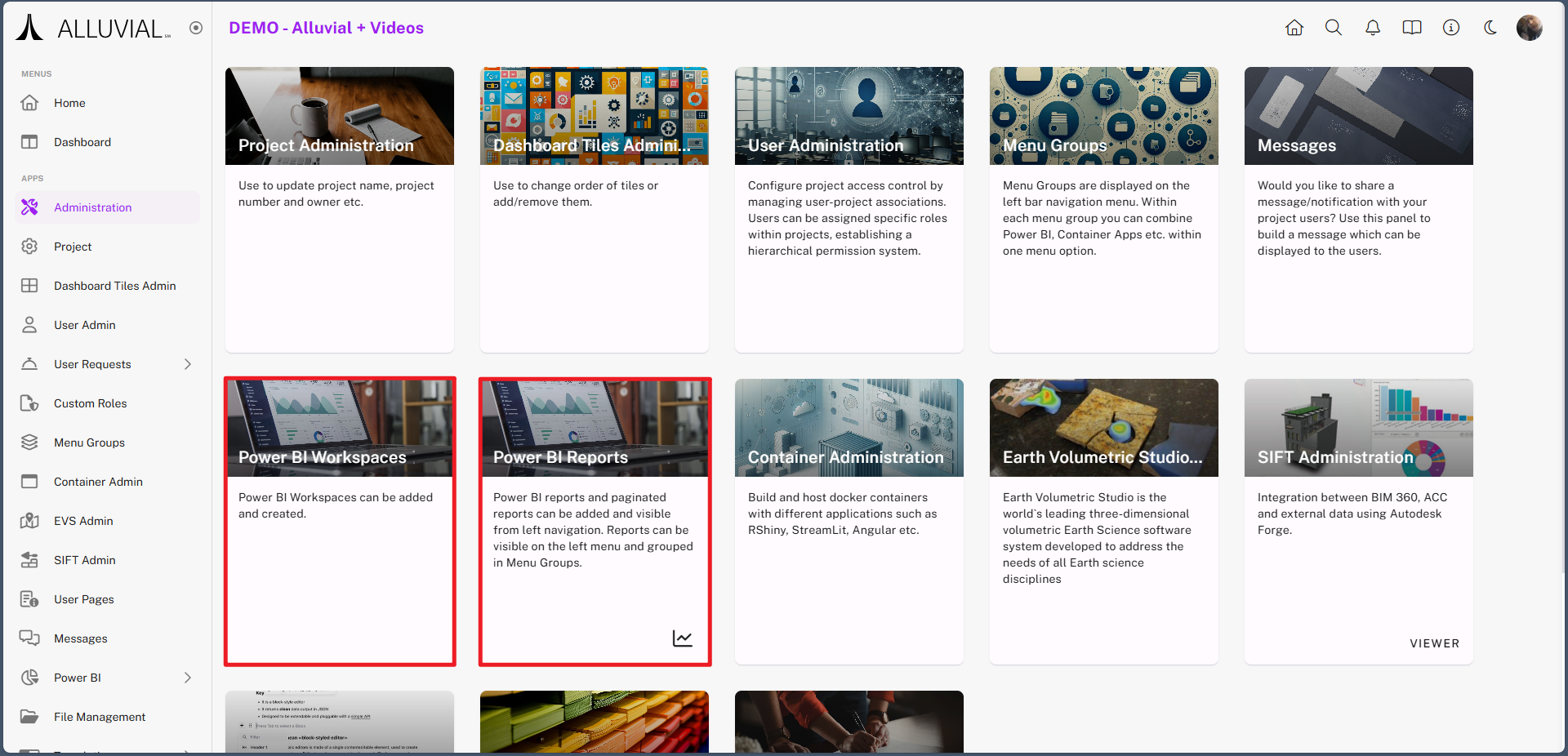 Alluvial supports embedding Power BI visualizations directly into the platform, enabling seamless sharing and collaboration with both internal and external project users.