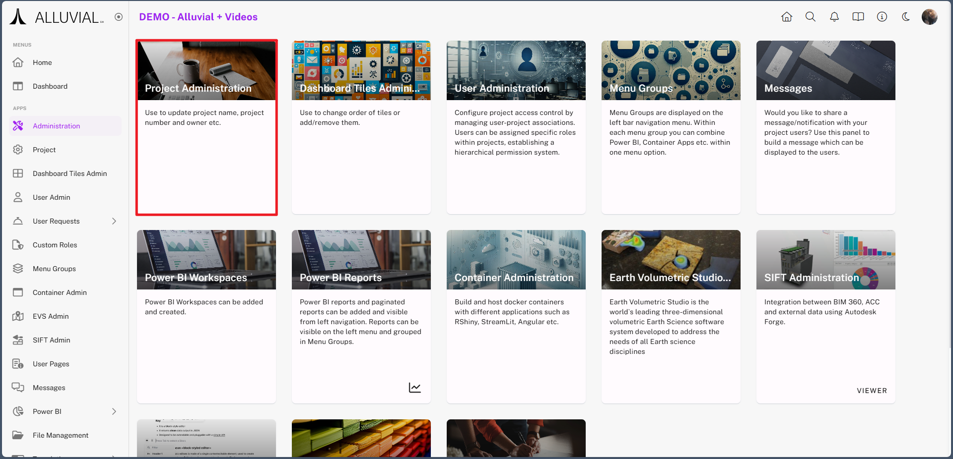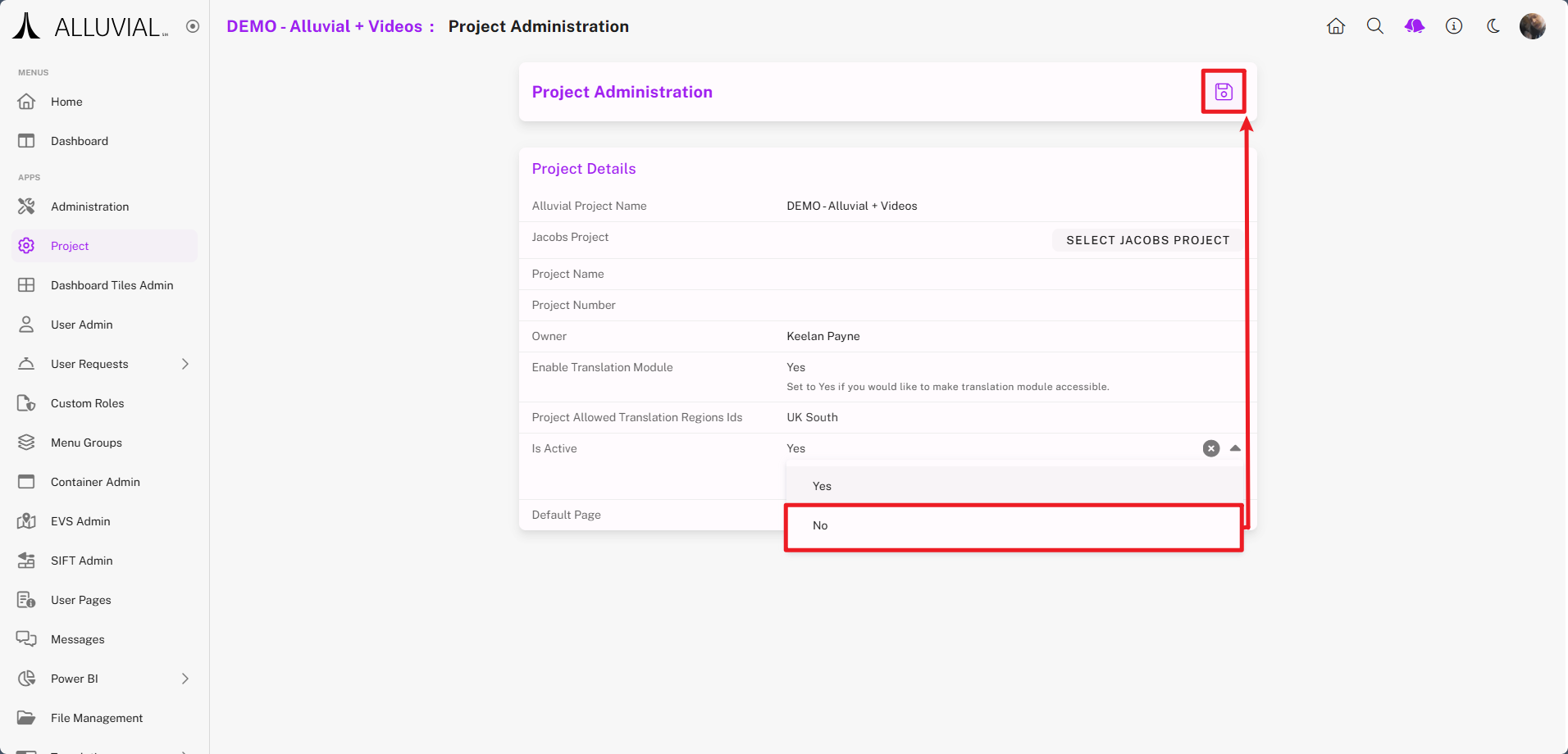 The Project Administration module allows project administrators to update key details and configurations for an Alluvial project.