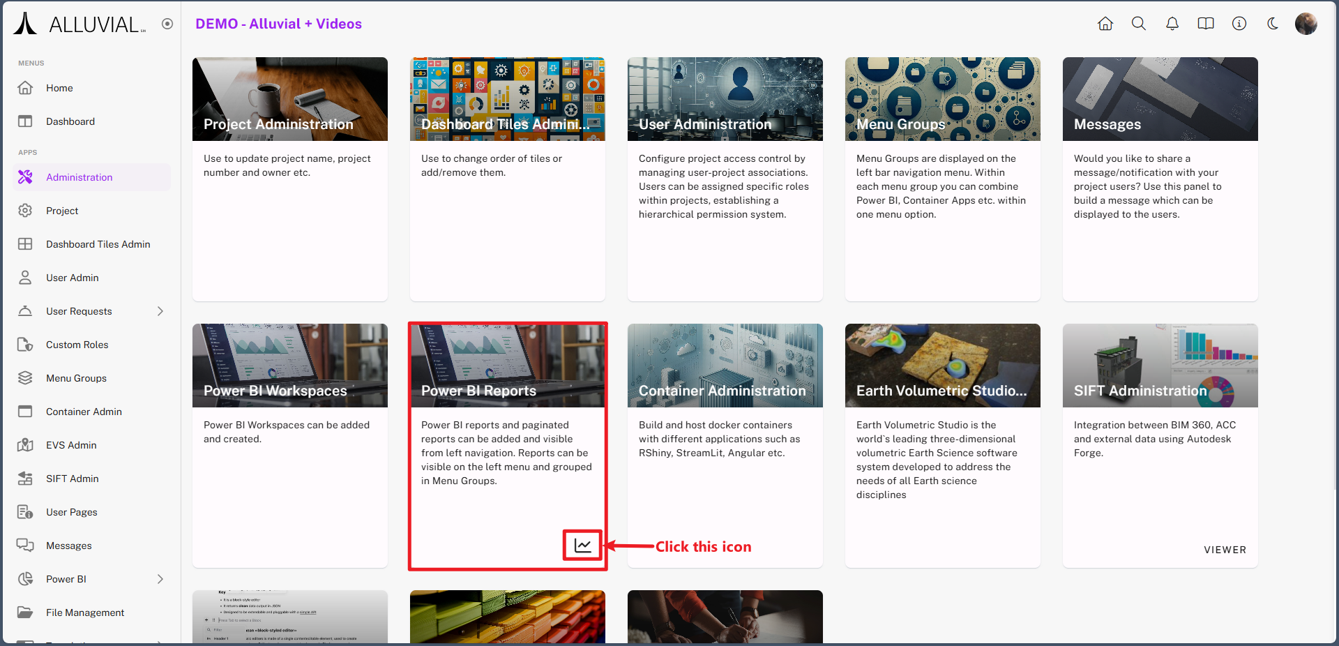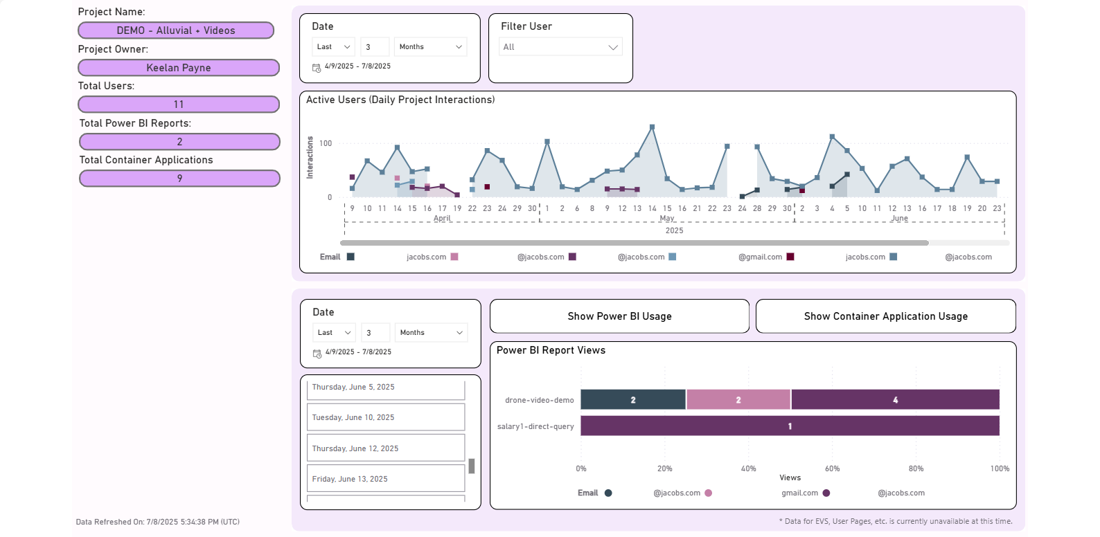The Workspaces & Reports Statistics dashboard in Alluvial provides insights into how users are interacting with content—particularly Power BI reports and container applications—within your project.