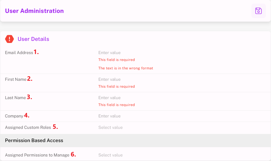 From this module, you can see user details such as email, role, company, and assigned permissions.