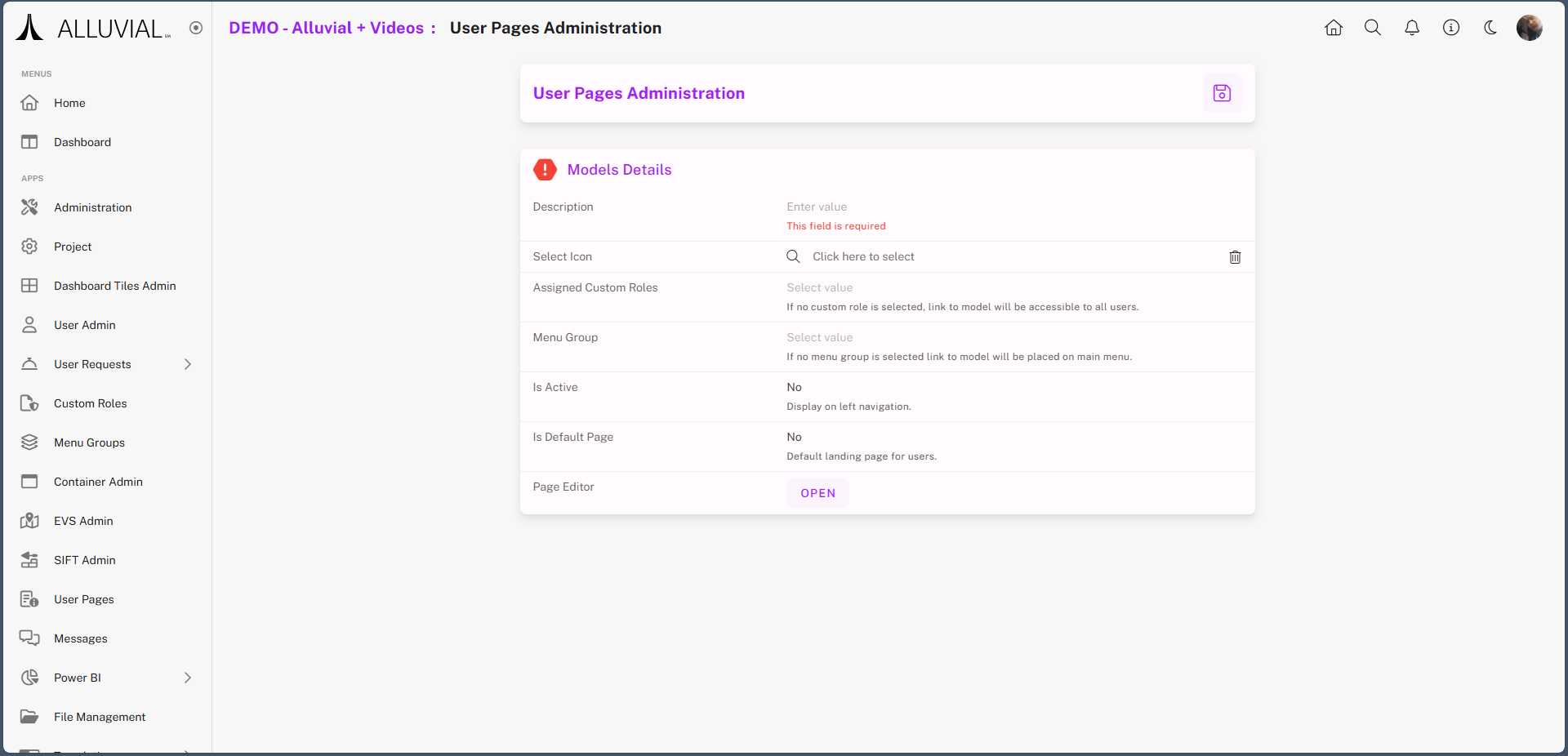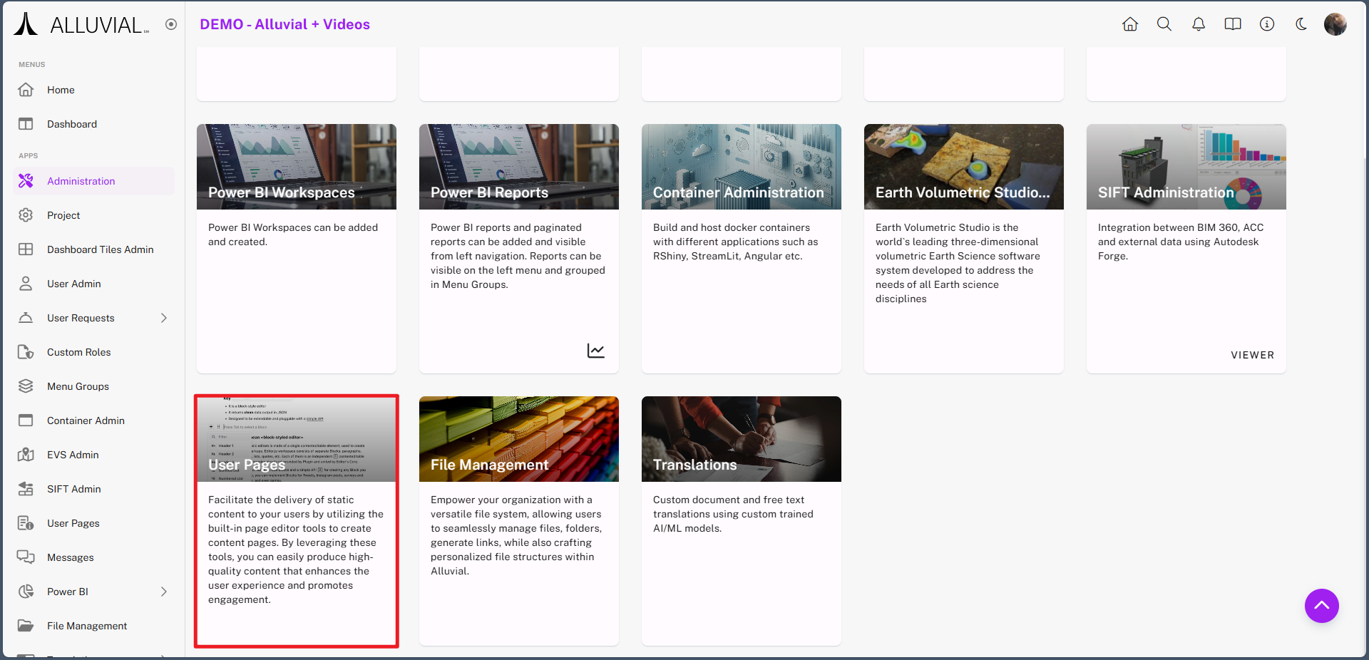 User Pages allow project administrators to create and publish static content directly within Alluvial.