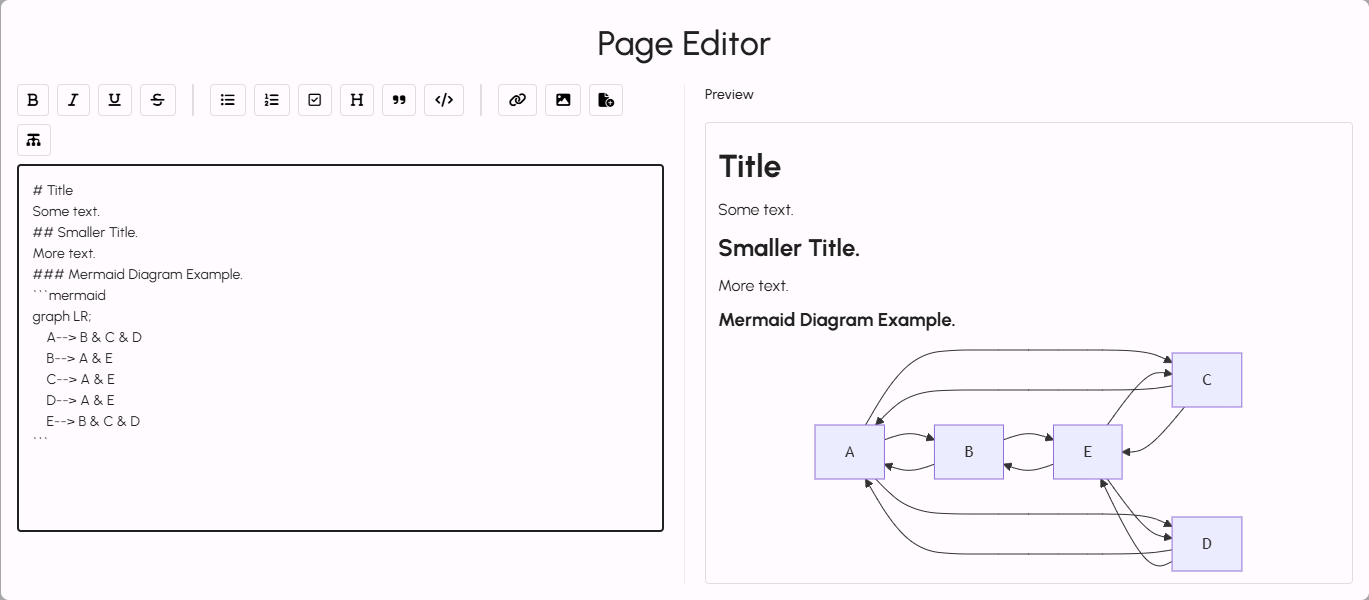 - Mermaid diagram syntax is supported for creating flowcharts and diagrams. For more details, see the Mermaid documentation.